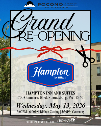 The Pocono Chamber of Commerce is excited to unveil the new and improved Hampton Inn to the community! Join us for the Grand Re-Opening and Ribbon Cutting on May 13th, from 5:00PM to 6:00PM, with the ceremony at 5:30PM.
