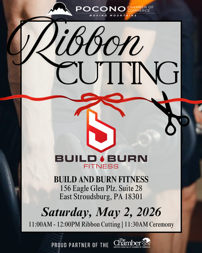 Join the Pocono Chamber of Commerce for the Build and Burn Fitness Ribbon Cutting on Saturday, May 2, 2026, from 11 AM to 12 PM, with the ceremony at 11:30 AM!