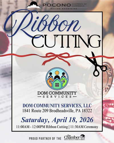 Join the Pocono Chamber of Commerce for the Dom Community Services LLC Ribbon Cutting on Saturday, April 18, 2026, from 11 AM to 12 PM, with the ceremony at 11:30 AM!