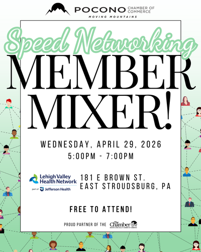 Get ready to mix, mingle, and make meaningful connections! Join the Pocono Chamber of Commerce at Lehigh Valley Hospital Pocono for our Spring Members Mixer on Wednesday, April 29th from 5:00 PM to 7:00 PM. Enjoy an evening of fun, fast paced speed networking designed to help you meet fellow members, spark new partnerships, and grow your business in a lively and welcoming atmosphere.