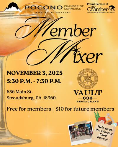 Join the Pocono Chamber of Commerce at Vault 636 on Monday, November 3rd for our November Member Mixer! This event will take place from 5:30 PM to 7:30 PM and is the perfect opportunity to grow your network with fellow Chamber members and local professionals.